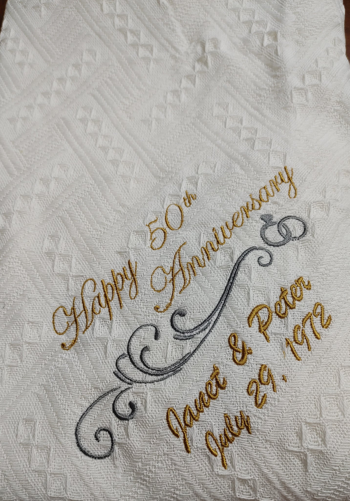 Our Embroidery designers may use their discretion to adjust sizing for best results. If you are embroidering more then one blanket, we recommend that you order all at once to ensure that the lettering size is consistent.